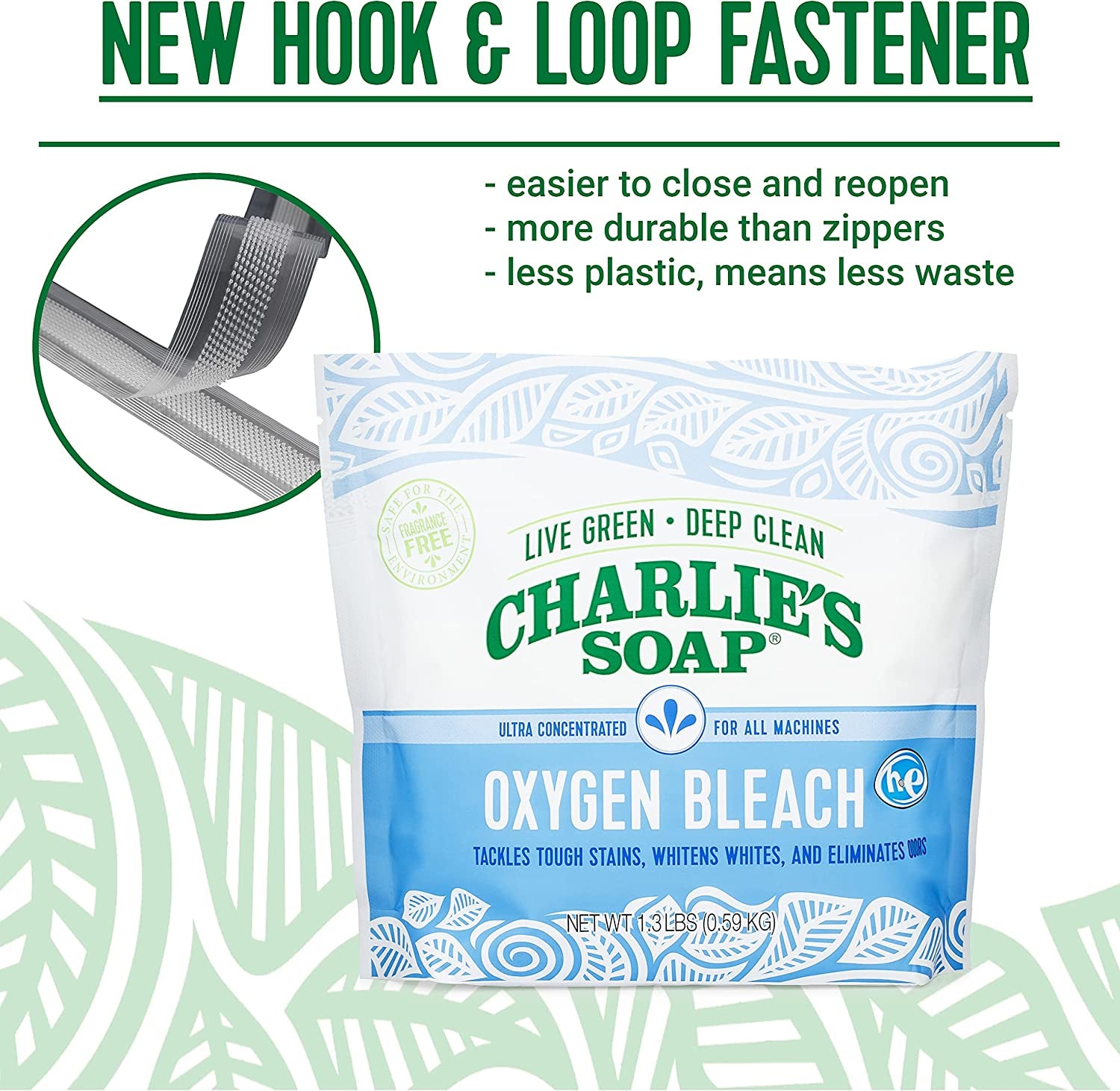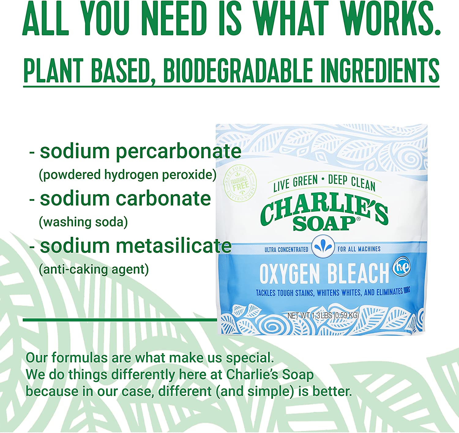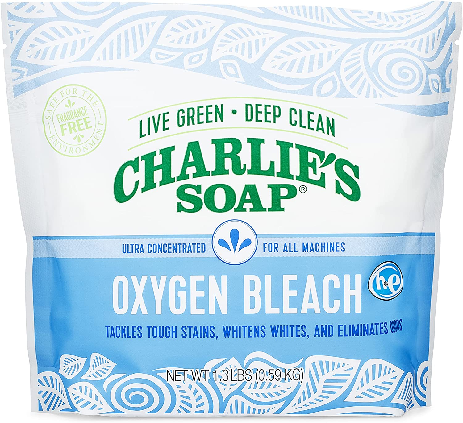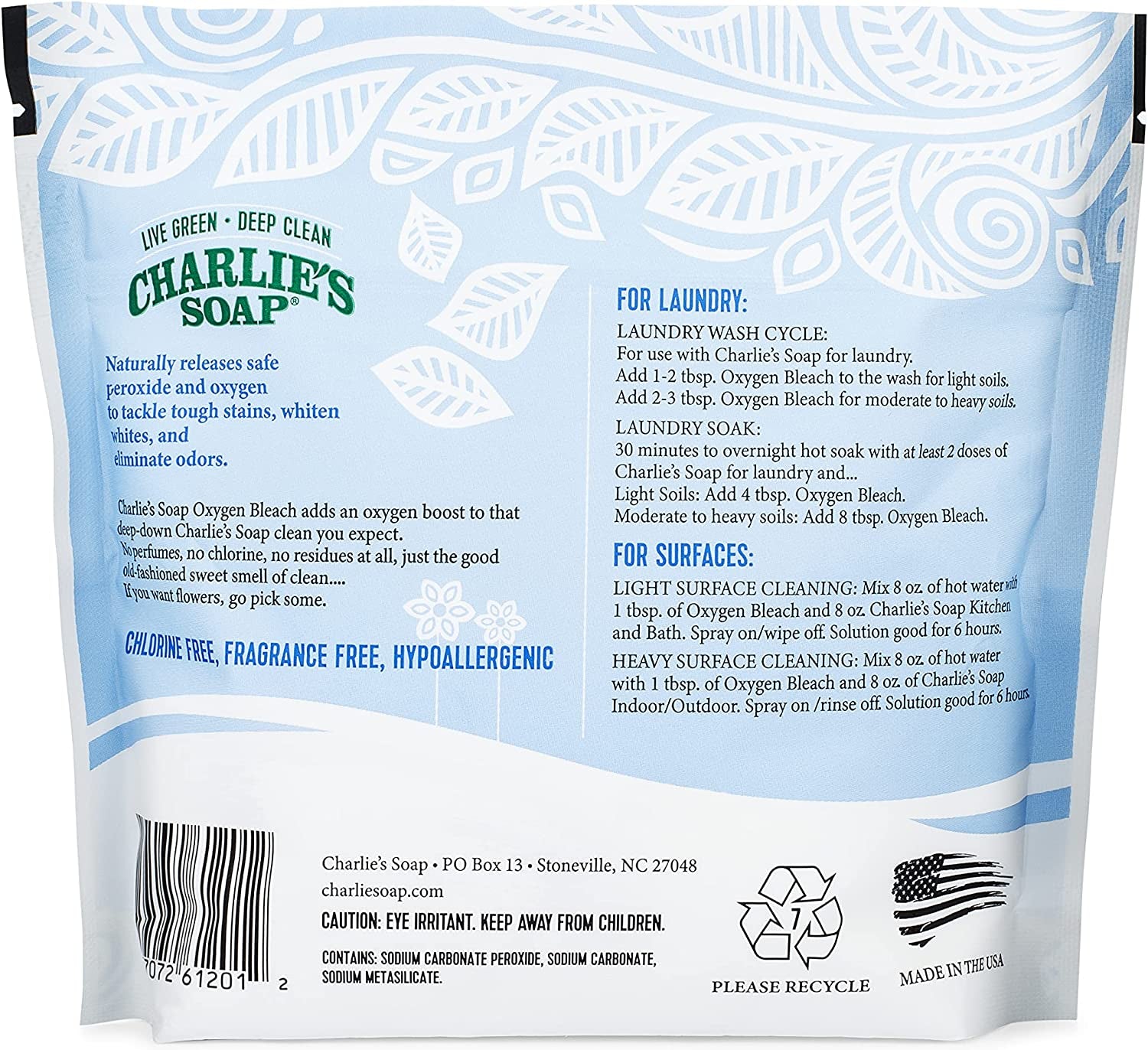 Charlie's Soap Oxygen Bleach naturally releases safe peroxide and oxygen to tackle tough stains, brighten whites and eliminate odors. It can be used with anything washable and is safer for the environment than traditional bleach. No perfumes, no chlorine and no residue left in your laundry! Charlie's Soap delivers the good old fashioned sweet smell of clean. If you want flowers, go pick some!
