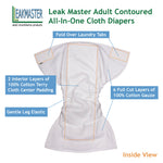 This popular and highly rated adult all-in-one cloth diaper features a multi-layered interior of soft, comfortable and absorbent cotton gauze and a soft waterproof outer layer of polyester. The soft and breathable outer layer prevents excess heat buildup and helps prevent rash. It has a contoured hourglass form fitting shape and strong and secure hook and loop closures (i.e., velcro type closures). Each diaper has 6 full width layers of 100% cotton gauze, with an additional two layers of thick and thirsty terry cloth in the middle pad area. The diaper has built in laundry tabs to prevent diapers from sticking together during wash. This incontinence brief has plenty of absorbency and is built to last.