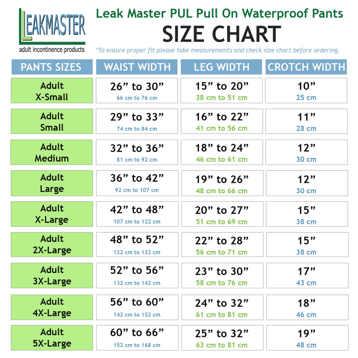 The LeakMaster Pul pants are stocked and available in sizes X-Small to 5X-Large. Larger sizes (2XL-5XL) priced higher due to extra sewing and material costs.