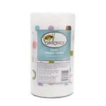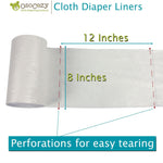 There are 100 sheets per roll and each sheet is a little smaller than 8 x 12 inches (20 x 30 cm). Great for any size or any type of cloth diaper. Just $8.00 for a roll of 100 sheets.